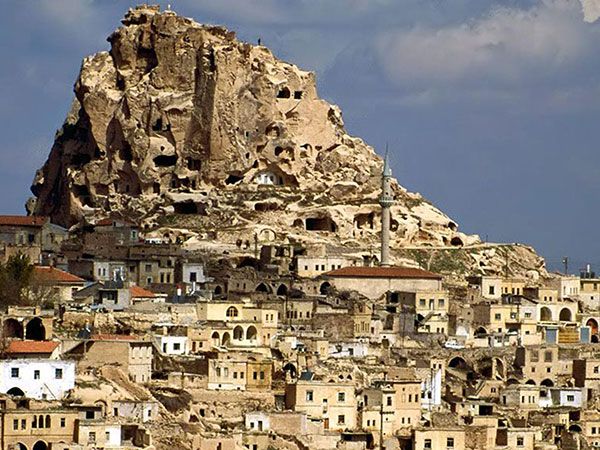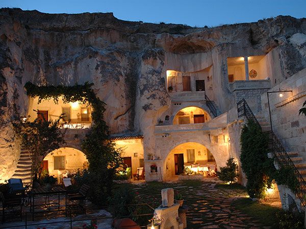 Traditional Cappadocian houses and dovecotes carved into stones are showing the uniqueness of the region. These houses are constructed on the feet of the mountain via rocks or cut stones. Rock, which is the only construction material of the region, as it is very soft after quarry due to the structure of the region, can be easily processed but after contact with air it hardens and turns into a very strong construction material. Due to being plentiful and easy to process of the used material, regional unique masonry is developed and turned into an architectural tradition. Materials of neither courtyard nor house doors is wood. Upper parts of the doors built with arches are decorated with stylized ivy or rosette motifs.